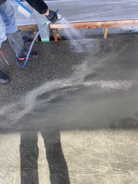 表面のモルタル分を丁寧に洗い流しながら、骨材が均一に現れるよう、範囲ごとに状態を確認しつつ作業を進めています。