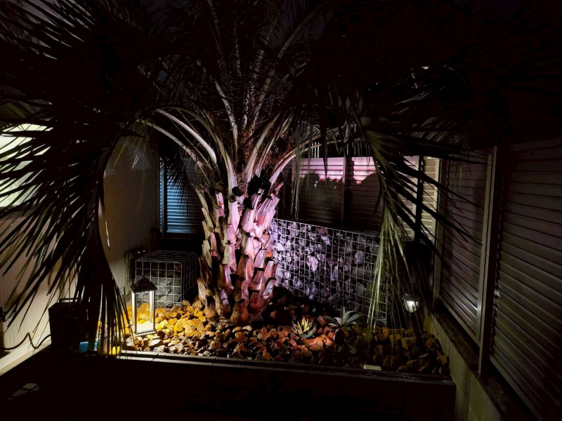 昼間はヤシの力強さや石の素材感が映え、リゾート感のある印象に。夜はライトアップによって植栽の陰影が際立ち、昼とはまた違った幻想的な雰囲気が生まれます。