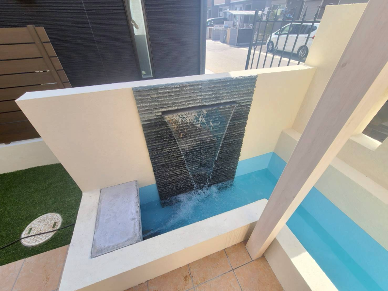 ゆったりと腰掛けられるスペースに加え、水の流れを感じられる演出を取り入れることで、日常の中に少し特別な時間が生まれるテラスに。